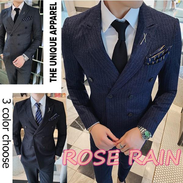 セール 新作 メンズ ファッション スーツ フォーマル 3点セット ストライプ 紳士服 ダブル スリーピース ビジネス 結婚式 細身 スリムフィット 3color 注目の Skylanceronline Com
